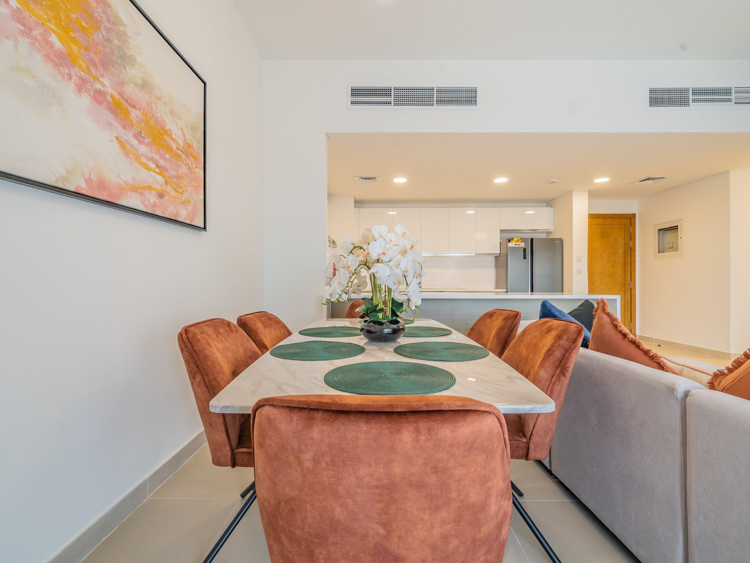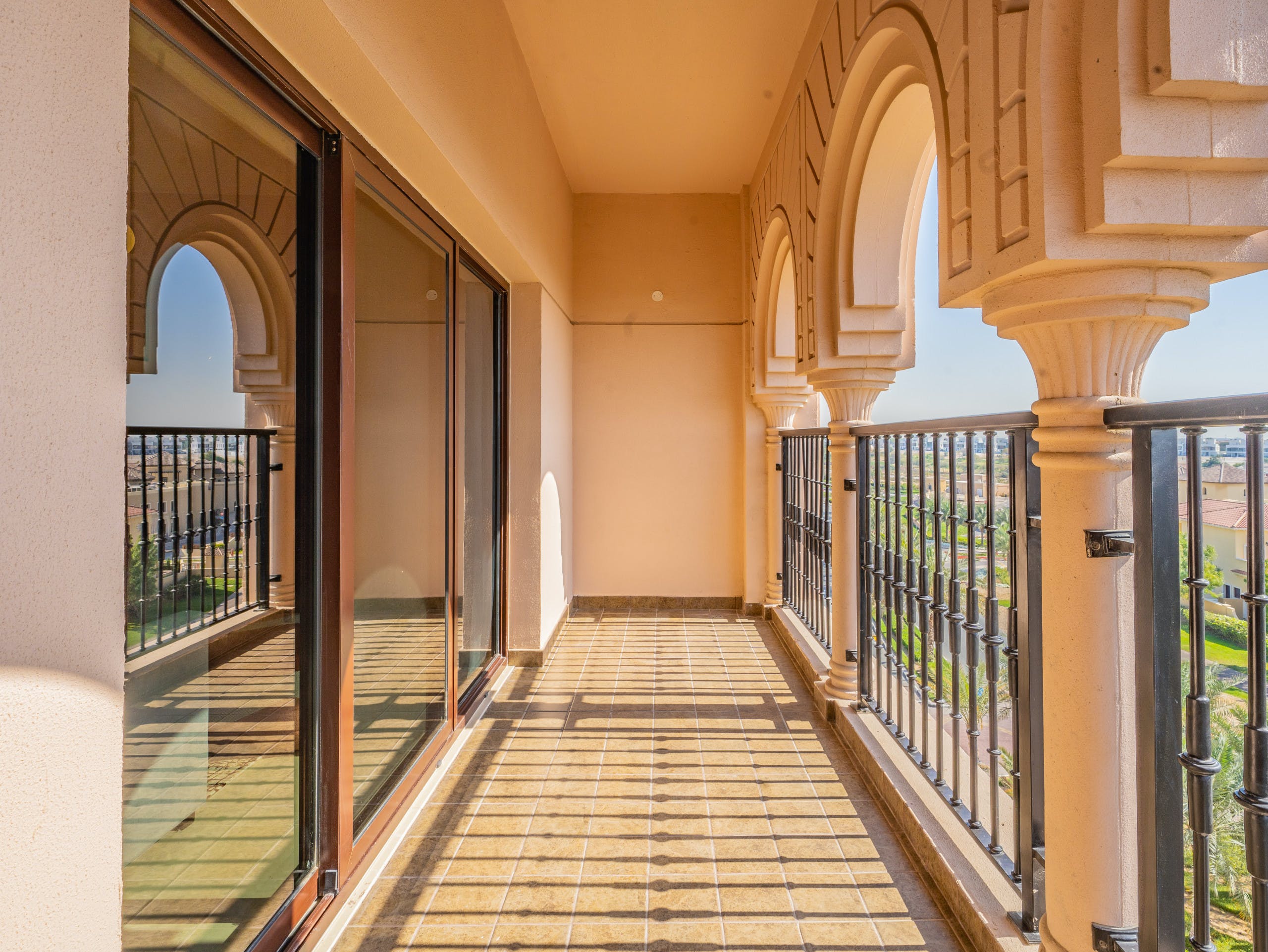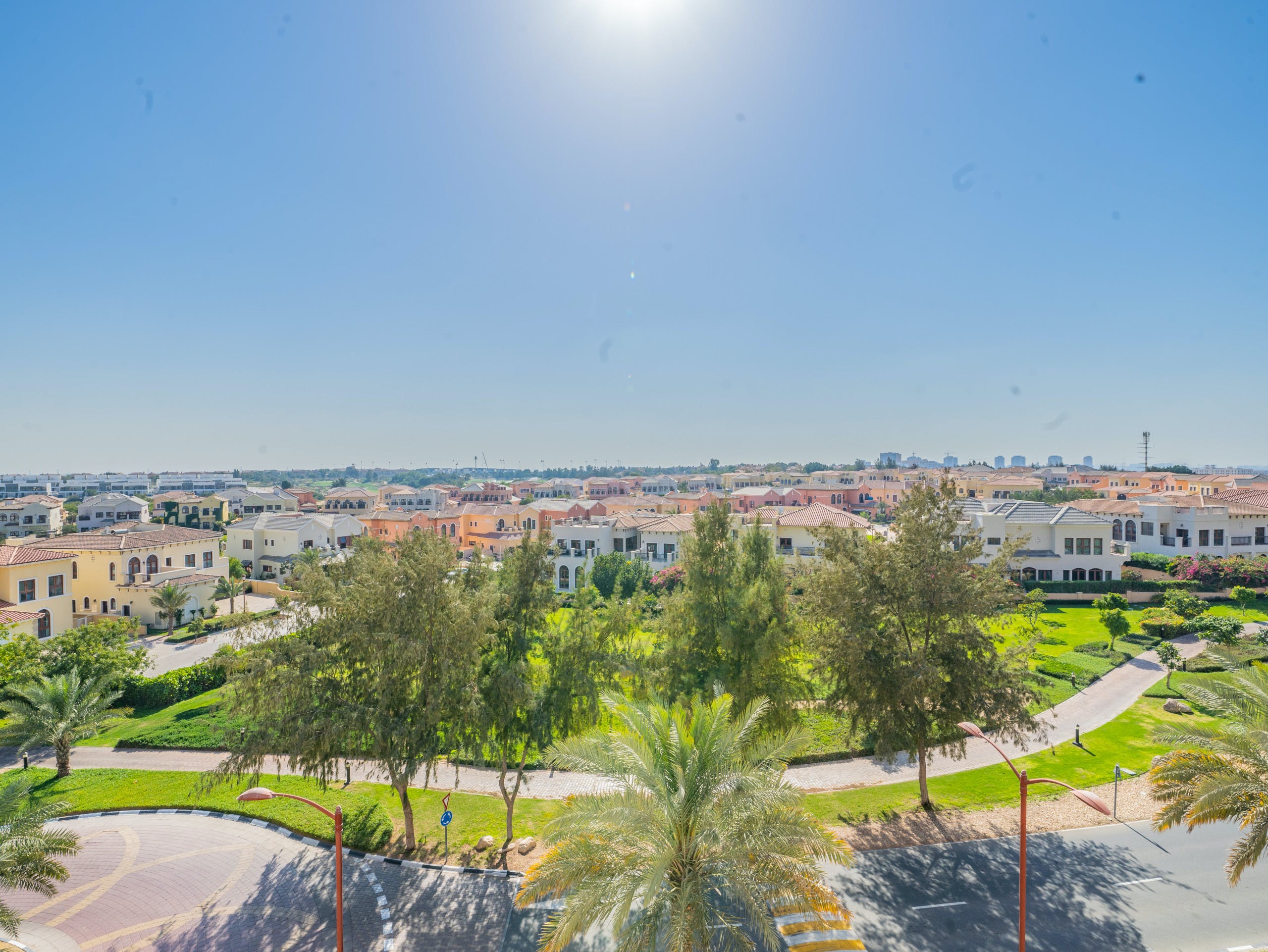 Located in a gated community on a golf estate, you’ll find pedestrian-friendly streets and a beautiful plaza that evokes Andalusia more than the Middle East. Set amidst two golf courses, you’ll find plenty of amenities, such as a country club, gym, shops, restaurants and bars.After a game of golf or a spot of shopping, take in the views over the development from your private balcony. Or, relax on the chaise sofa in the spacious open plan living area with its patio doors and pots of orchids. For dinner, cook up an Emirati feast of machboos (rice and shrimp, spiced with cinnamon and cardamom) in the modern kitchen and enjoy it at the dining table with its plush velvet chairs – this place is perfect for entertaining.