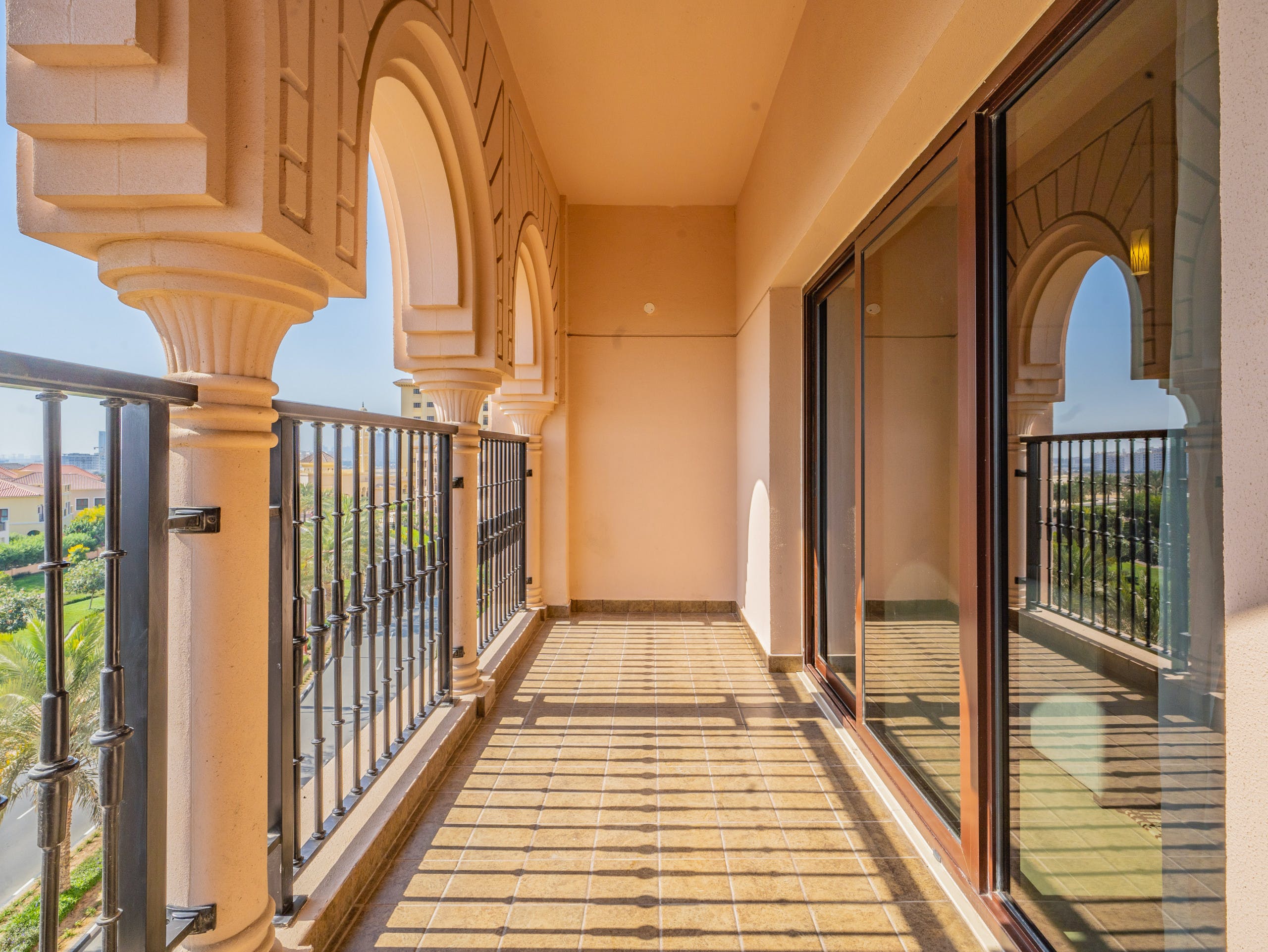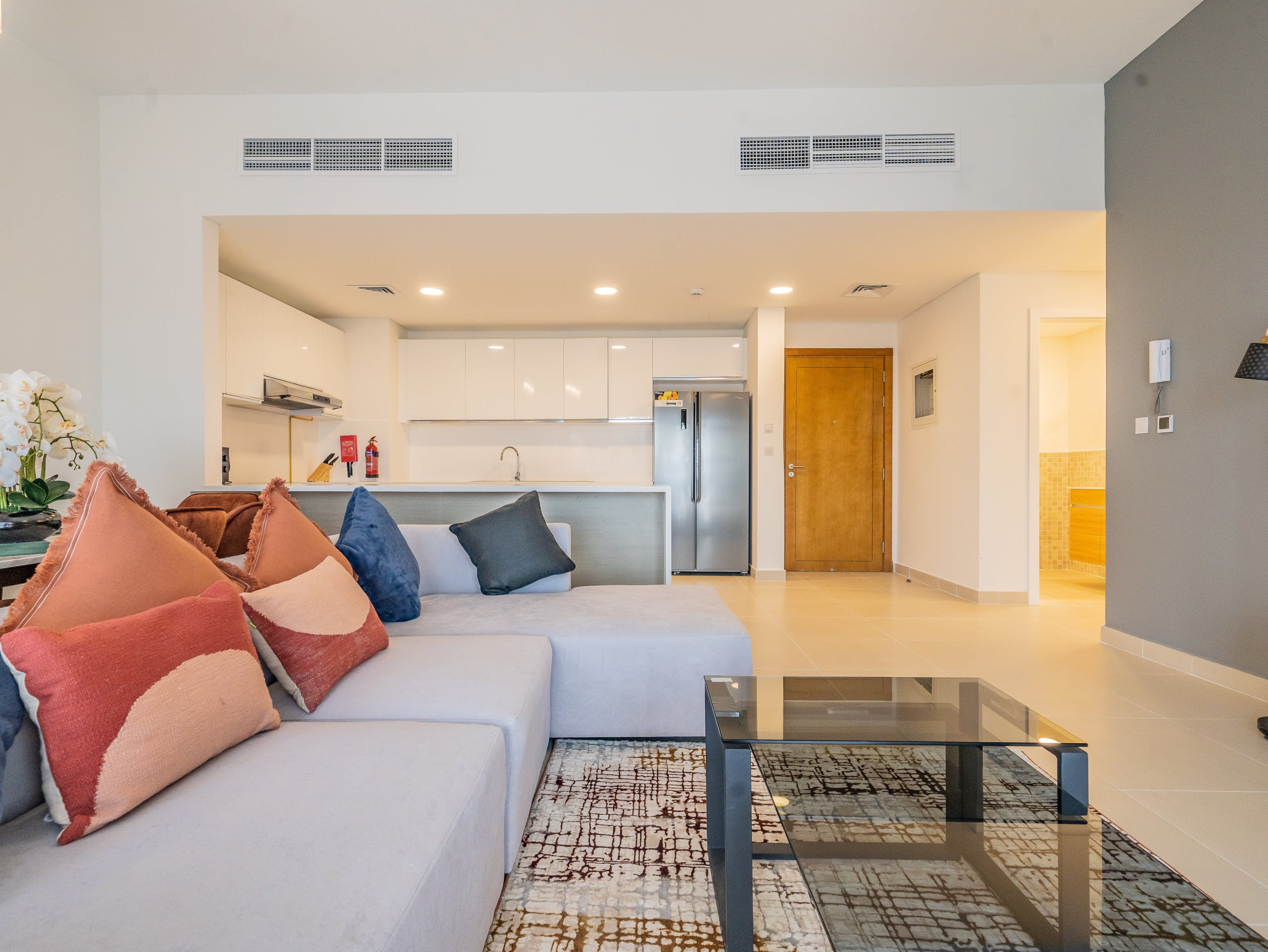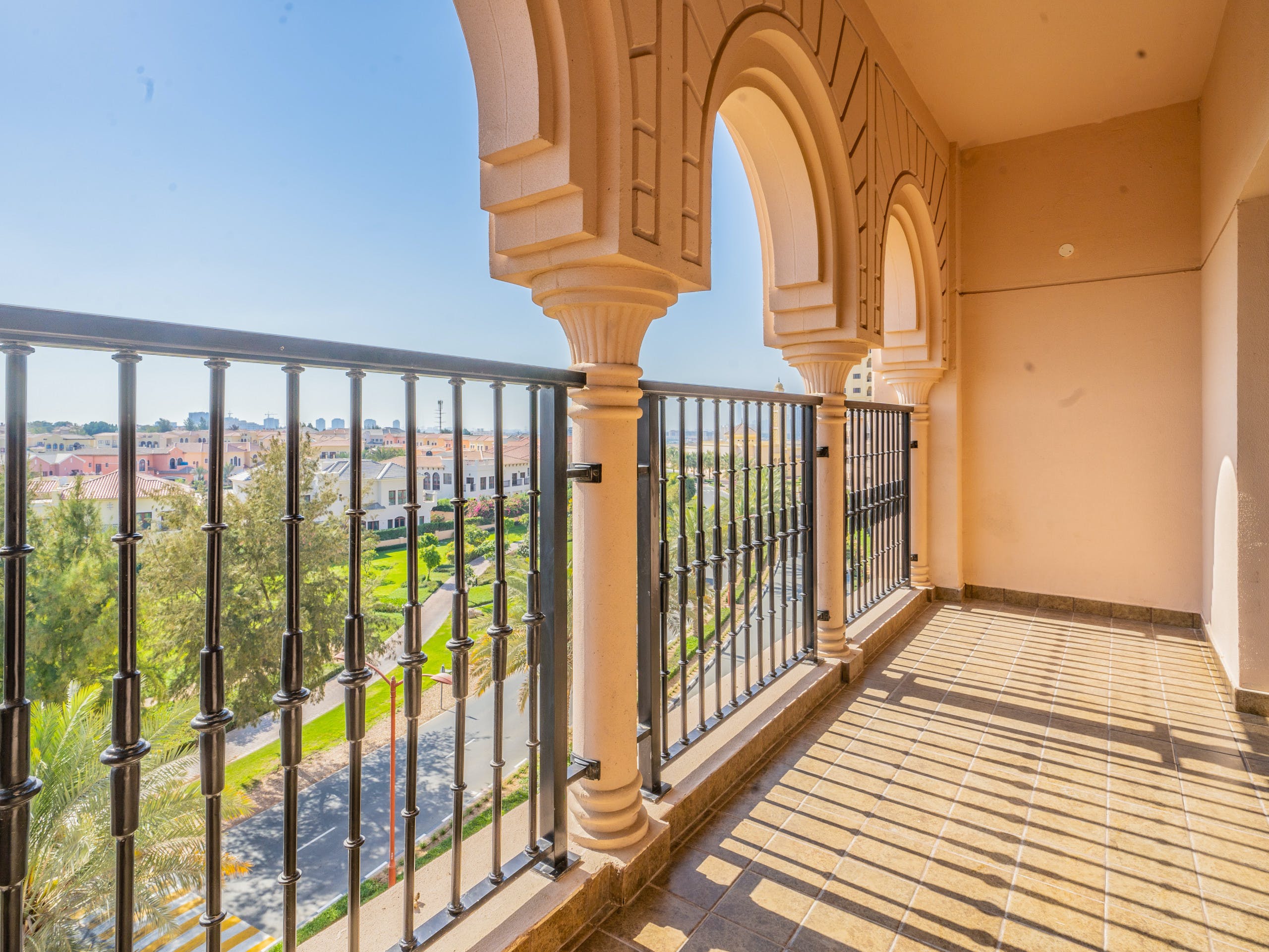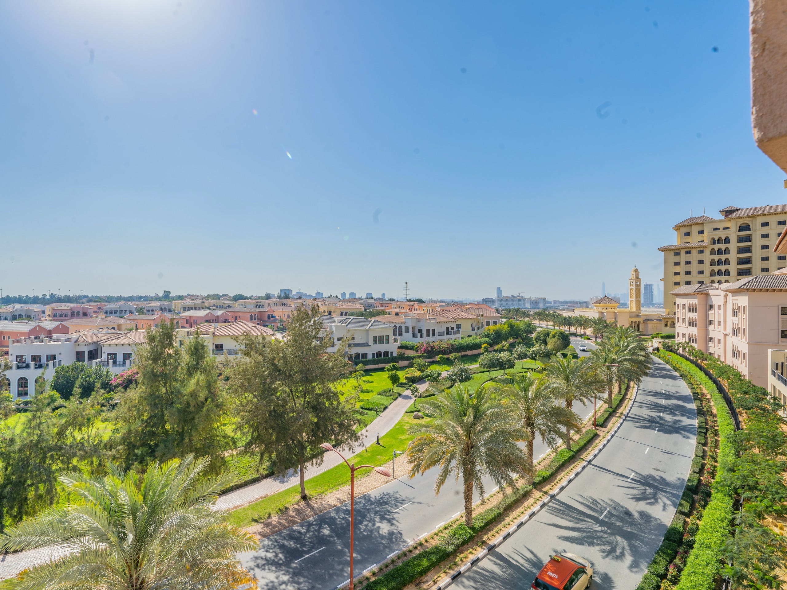 Located in a gated community on a golf estate, you’ll find pedestrian-friendly streets and a beautiful plaza that evokes Andalusia more than the Middle East. Set amidst two golf courses, you’ll find plenty of amenities, such as a country club, gym, shops, restaurants and bars.After a game of golf or a spot of shopping, take in the views over the development from your private balcony. Or, relax on the chaise sofa in the spacious open plan living area with its patio doors and pots of orchids. For dinner, cook up an Emirati feast of machboos (rice and shrimp, spiced with cinnamon and cardamom) in the modern kitchen and enjoy it at the dining table with its plush velvet chairs – this place is perfect for entertaining.